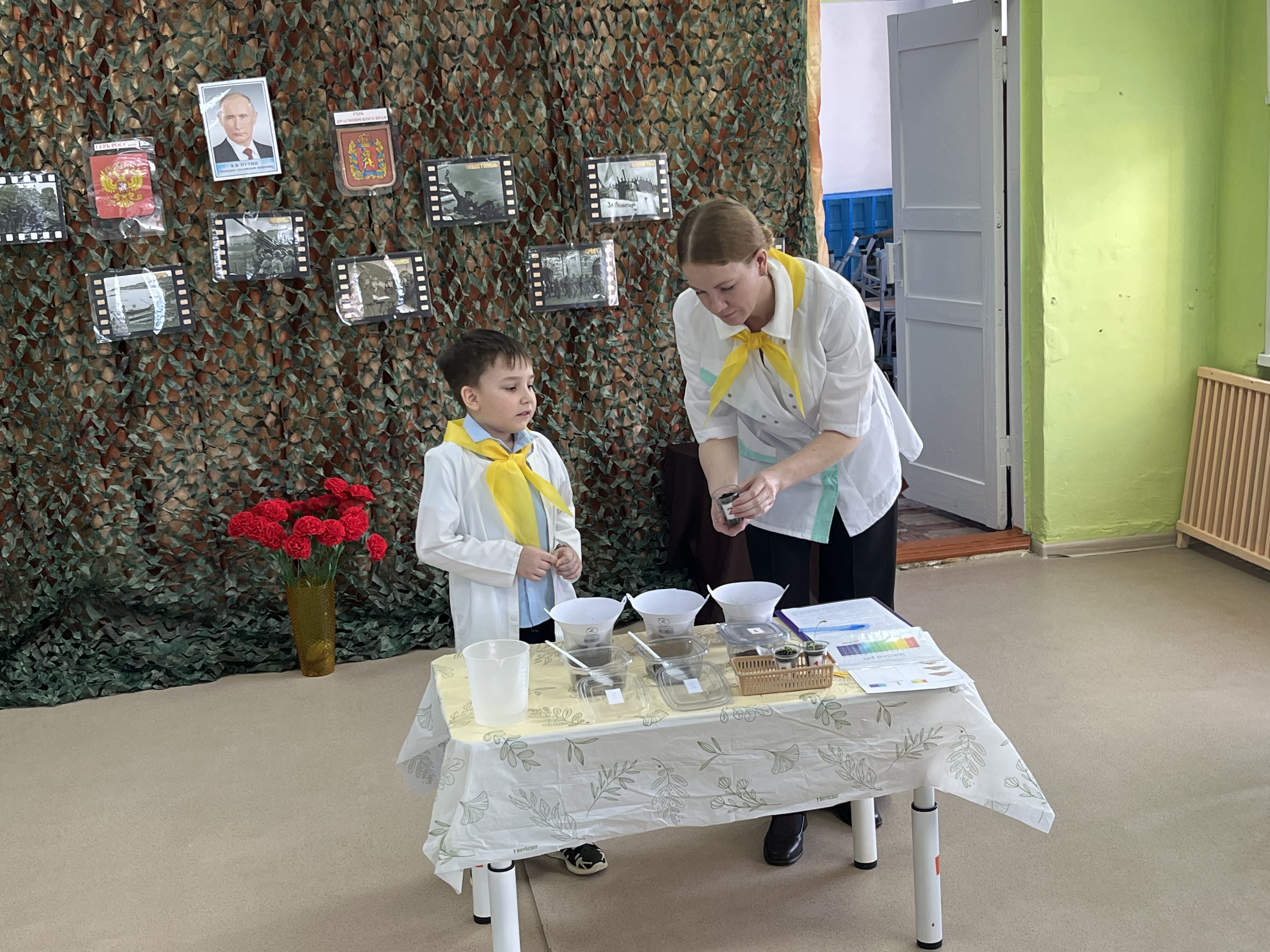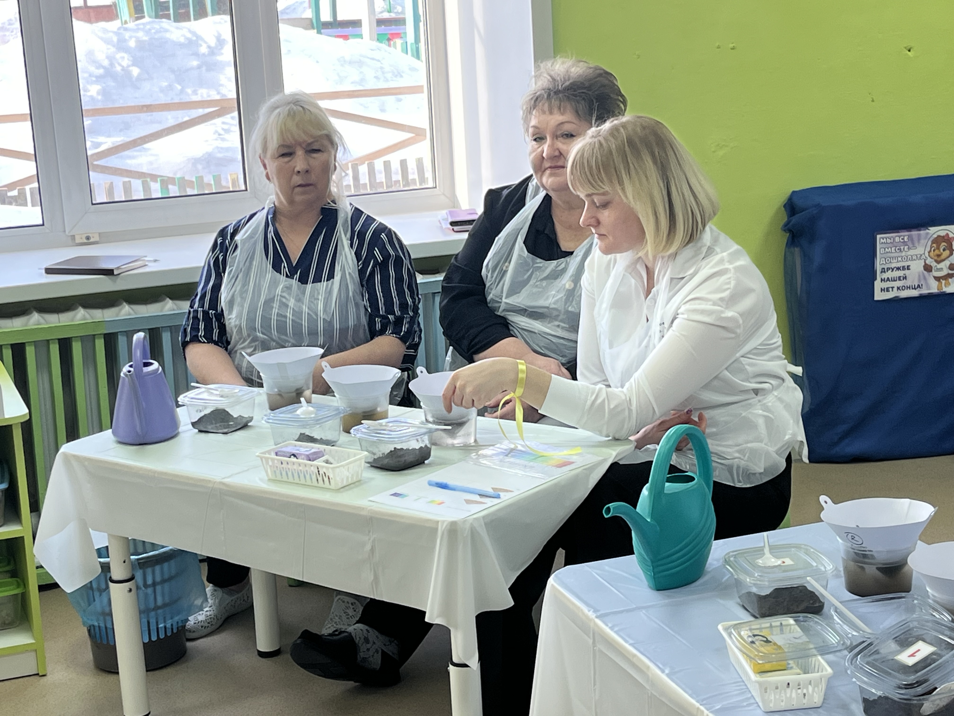 Часть педагогов приняли участие в работе биологической лаборатории «Юные почвоведы». Руководил работой воспитанник подготовительной к школе группы Мельниченко Тимофей под наставничеством Волковой Галины Владимировны. Тимофей рассказал гостям о способе определения подходящей для рассады почвы и предложил самим провести исследования образцов.
